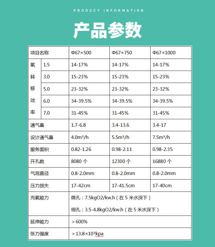 1.曝氣膜管采用三元乙丙橡膠(EPDM)材料,具有耐熱、耐臭氧、耐酸堿、化學穩定性好等特點,與一般橡膠膜相比,可大大提高其使用壽命。