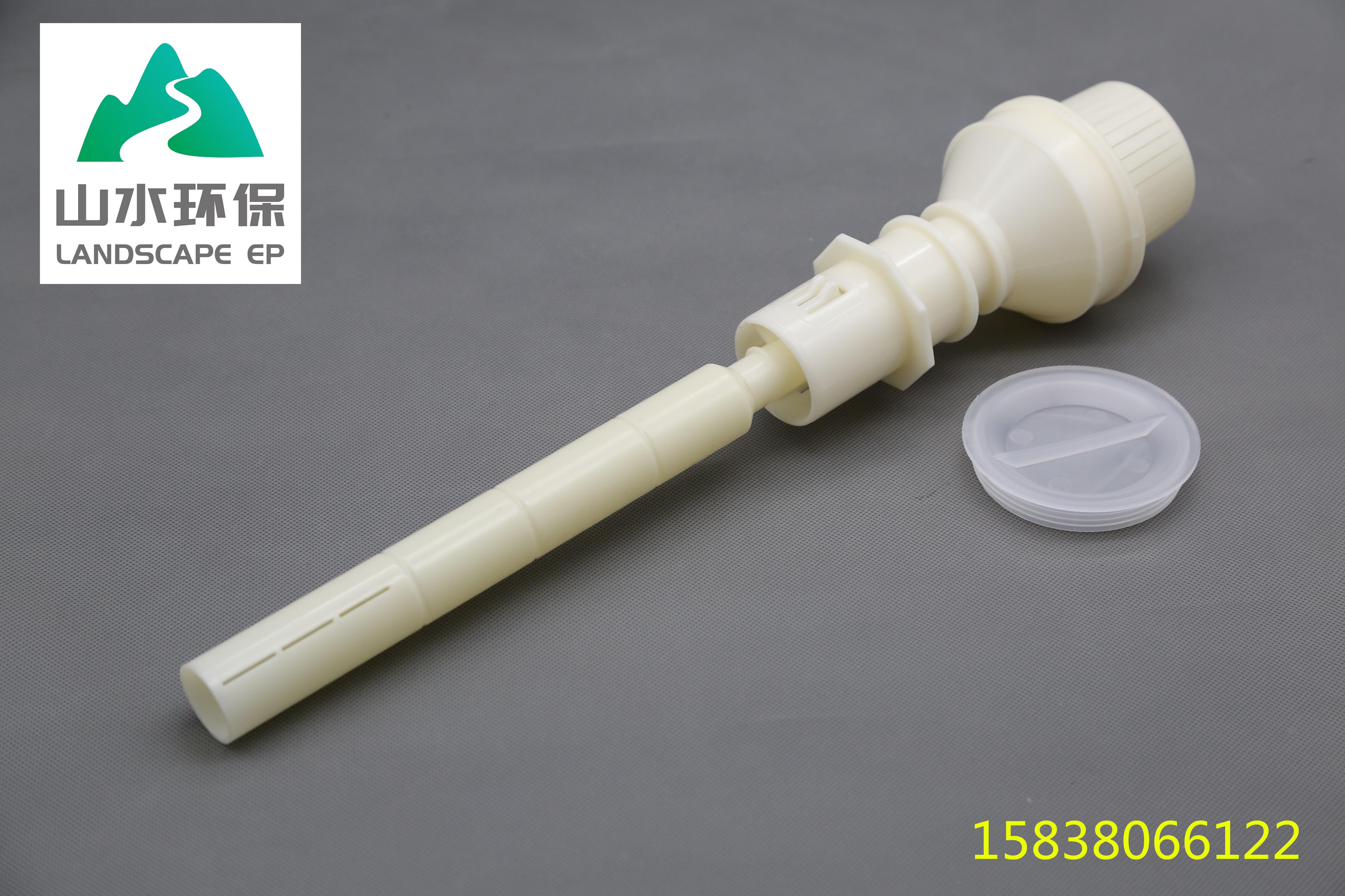 可調(diào)式長(zhǎng)柄濾頭是一 種由濾桿、預(yù)埋件、和濾帽組成的可調(diào)節(jié)性長(zhǎng)柄氣、水反沖濾頭,其特征在于濾桿是通過它上面的外螺紋和預(yù)埋件上的內(nèi)螺紋,使它與預(yù)埋件相連接,其濾桿與預(yù)埋件之間的相對(duì)位置可調(diào),另外在預(yù)埋件下部的外柱面上設(shè)置有4~8條具有彈性呈斜面狀的倒鉤,在預(yù)埋件上部的圓周邊端面上開有鋸齒形的斜齒,濾帽也是通螺紋與預(yù)埋件的上部相連,同時(shí)在濾帽中間圓盤的下端面也開有鋸齒形的斜齒,其斜齒的方向與預(yù)埋件上的斜齒方向相反。