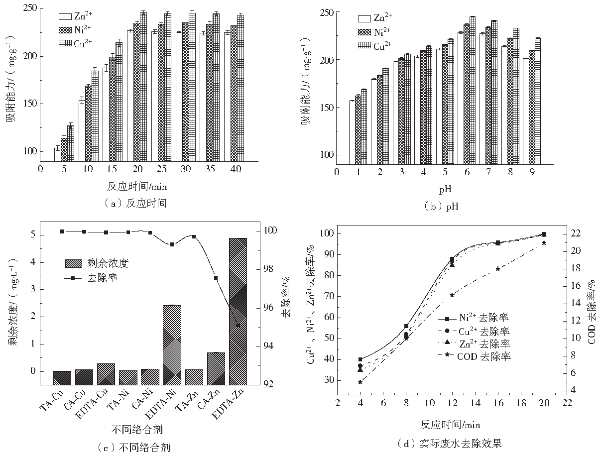在室溫條件下,取250 mL、100 mg·L−1模擬CA-Cu、CA-Ni、CA-Zn廢水置于250 mL 錐形瓶中,加入0.1 g重金屬捕集劑PADTC,置于搖床中振蕩5 min后再靜置15 min,取上清液過濾后用原子吸收分光光度計(jì)測(cè)定溶液中殘留的重金屬離子濃度,分別研究了pH和反應(yīng)時(shí)間對(duì)PADTC去除重金屬的影響,以及對(duì)CA、TA、EDTA 3種絡(luò)合劑與Cu、Ni、Zn 3種重金屬離子絡(luò)合后的處理效果。