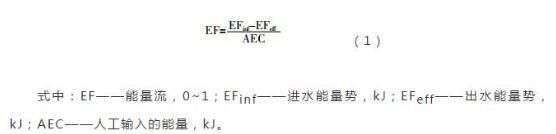 能量流分析是將進出污水處理系統(tǒng)的各種污染物按照能量的方式統(tǒng)一計量,將污水處理廠的運行效果從物質角度的多指標評價轉化成從能量角度的單一指標評價。能量流的定義如式(1)所示。