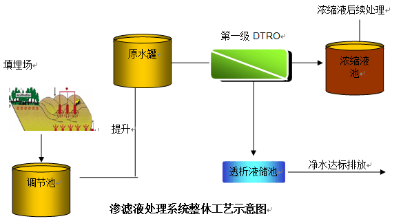 調(diào)節(jié)池滲濾液經(jīng)泵提升至滲濾液原水儲罐,進(jìn)行pH值調(diào)節(jié)、砂濾器、保安過濾器等簡單預(yù)處理后,進(jìn)入單級DTRO,經(jīng)DTRO處理后產(chǎn)生的透過液排放,DTRO的濃水排至濃縮液儲池等待進(jìn)一步處理DTRO工藝整體處是流程如下圖所示: